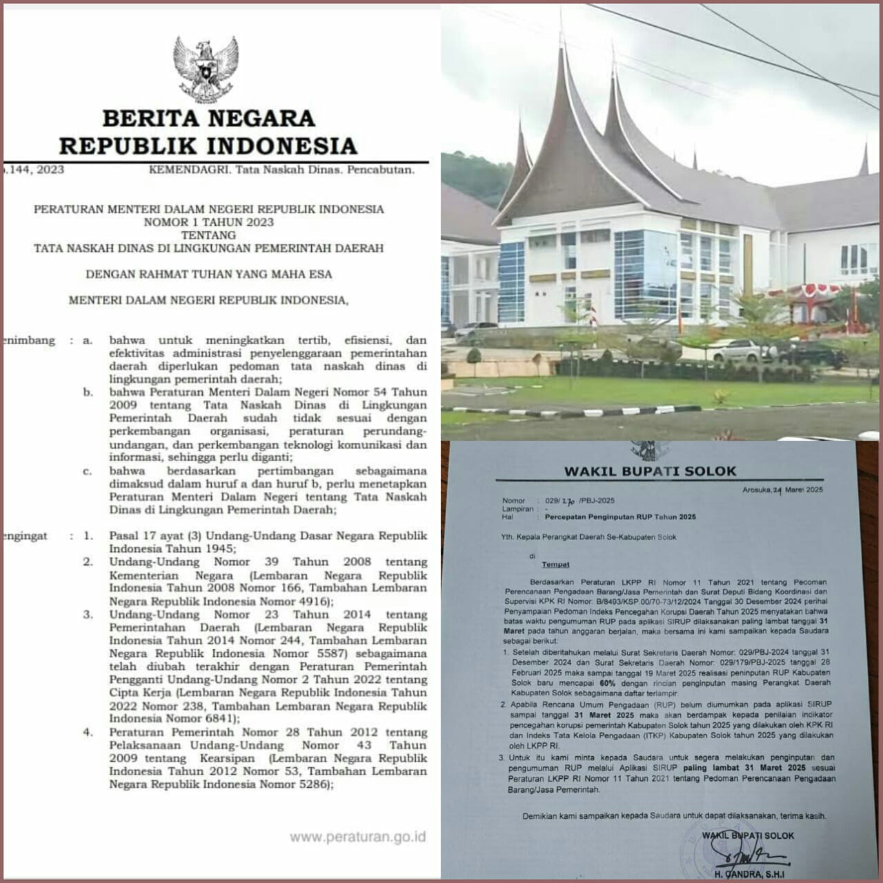AROSUKA, baritonagarinews.com - Menyikapi ramainya postingan di beberapa media sosial terkait penggunaan Kop Wakil Bupati Solok perihal Percepatan Penginputan RUP Tahun 2025, Pemerintah Daerah (Pemda) Kabupaten Solok menjelaskan bahwa, penggunaan Kop Wakil Bupati tersebut sudah sesuai dengan Peraturan Menteri Dalam Negeri (Permendagri) Nomor 1 Tahun 2023 tentang Tata Naskah Dinas di Lingkungan Pemerintah Daerah.